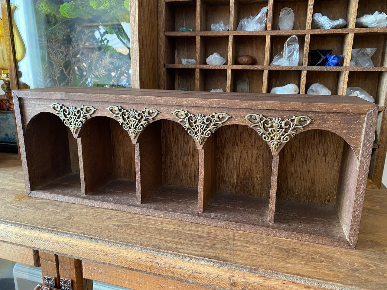 5つのスペースに仕切って上部はアーチ型にカット、デザイン金具を取り付けています。