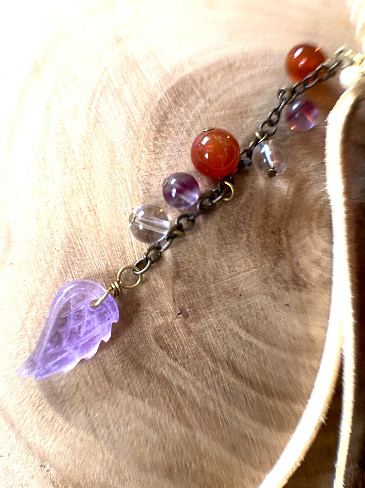 小さいほうきの装飾は、アメジストの天使の羽カット、水晶、カーネリアン、フローライトのラウンドです。