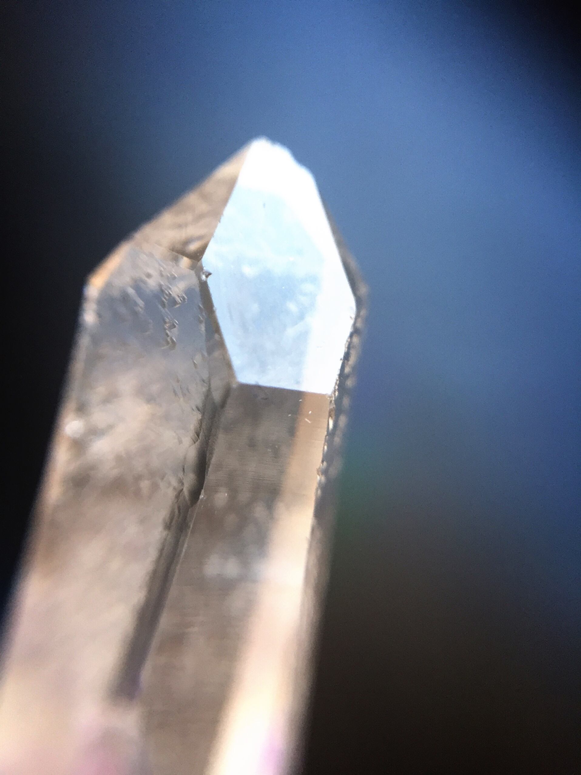 セットしている水晶ポイントは、ファセットにとてもバランスの良い五角形の「イシス」と呼ばれる面を持っています。