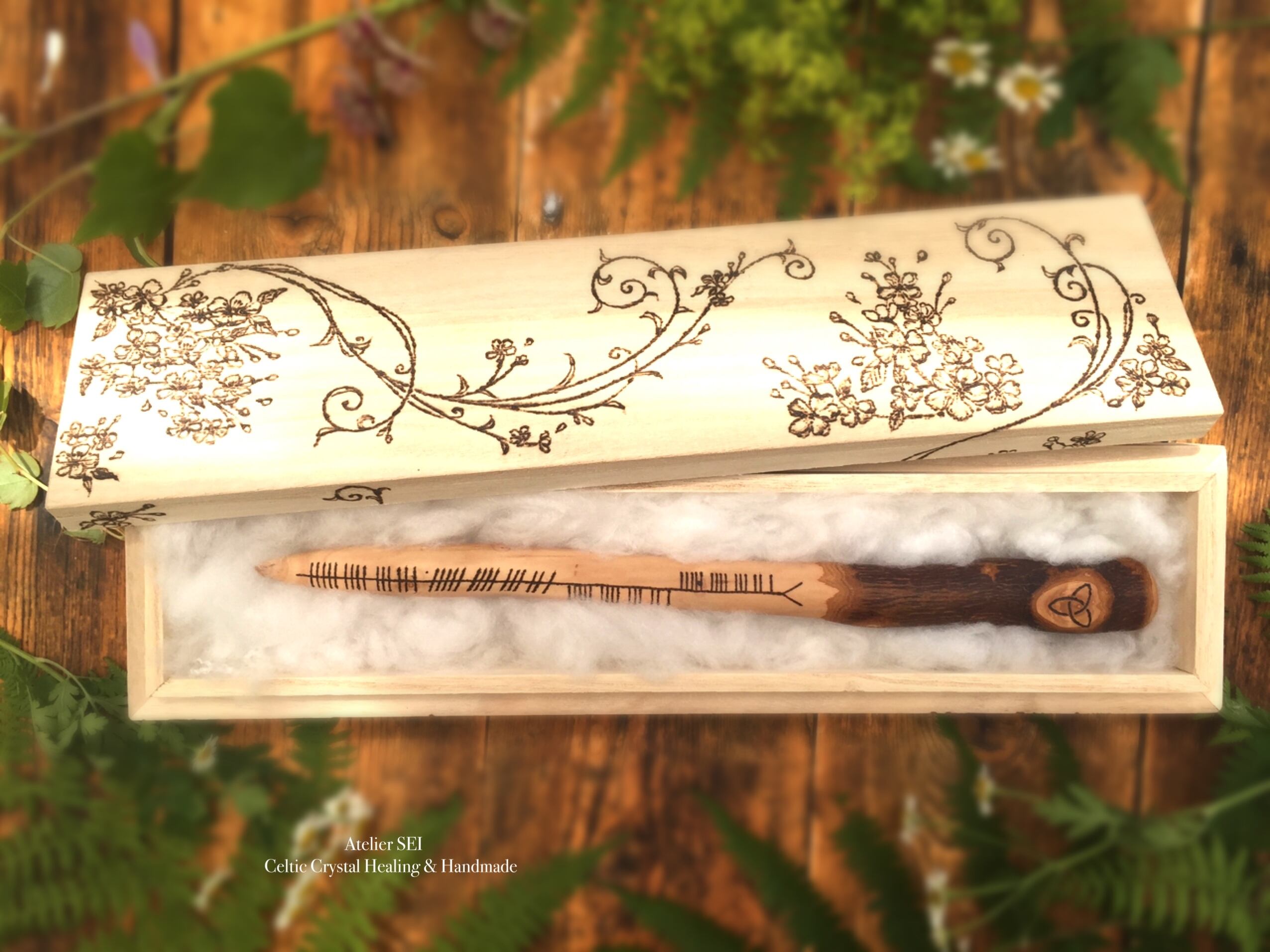 魔法の杖(ワンド)は、完成後に精油を塗り、古代ケルトの祝福の儀式で浄化とエネルギーチャージを行い、専用の木箱に納め、魔法の杖の使い方の「指南書」をお付けしてマスター様にお渡ししています。