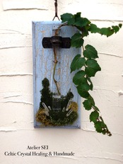 木板にアンティークペイントして粘土やモス(苔)、ナチュラル水晶ポイントで造形し、ガラスの試験管を支えています。
