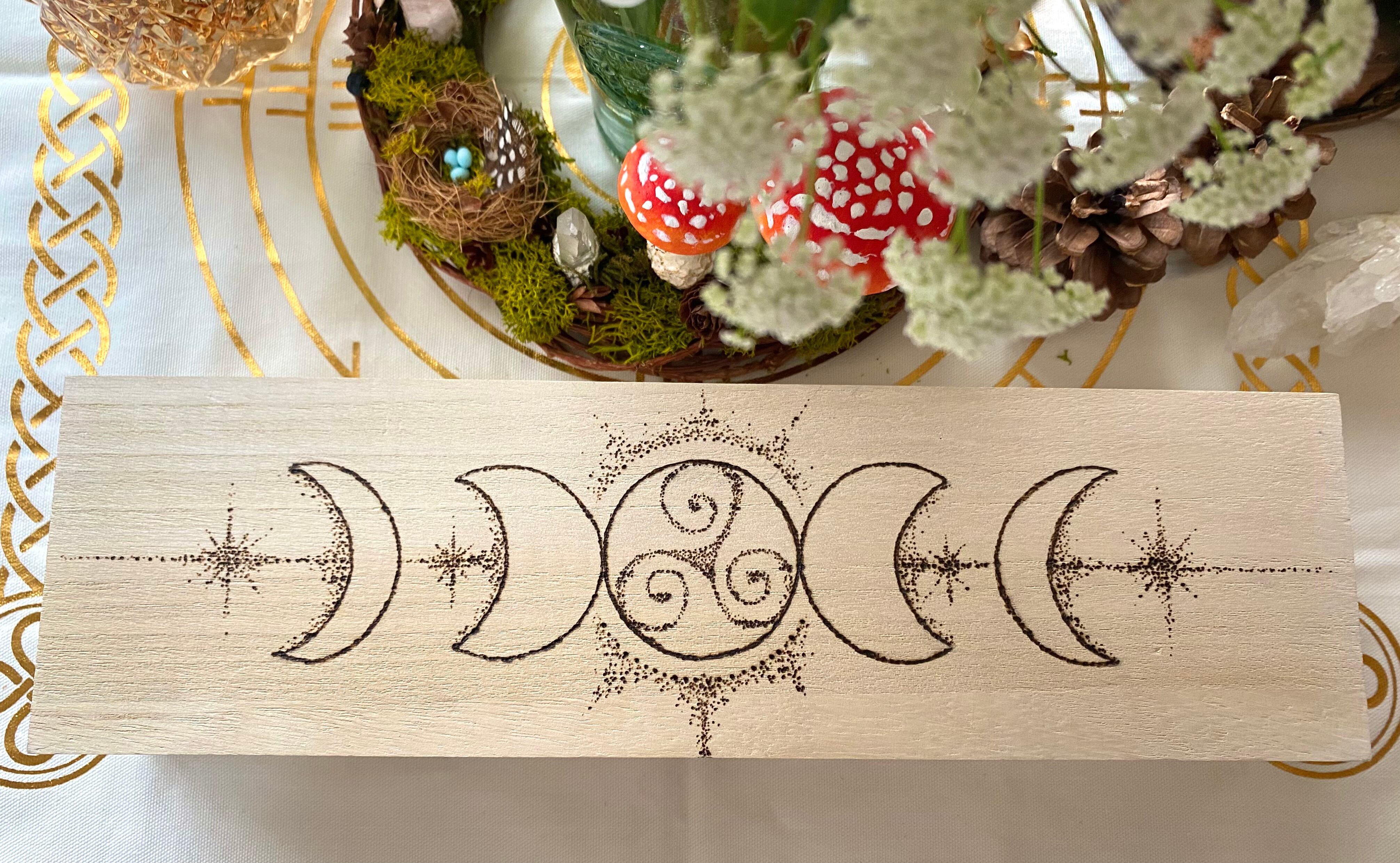 ケルトの満ちる月、欠ける月を描き、満月の中にはトリスケリオンを点描で描いています。
